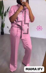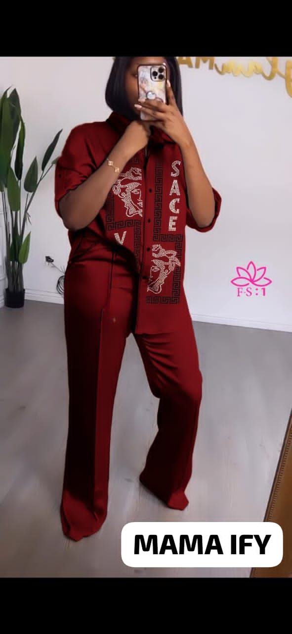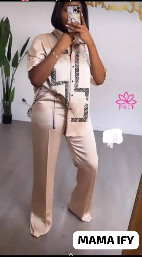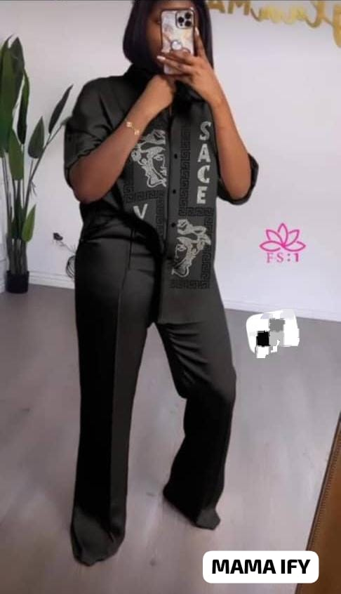 Elevate your style with this chic women's outfit, featuring a beautifully printed shirt and matching pants. Perfect for casual outings, work, or social events, this set offers both comfort and fashion-forward design. Available in multiple colors. Trendy, fashionable, women's clothing, two-piece set, printed design.