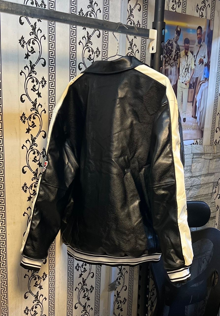 Step out in style with this Avirex All Star Game varsity jacket. It's great for your outings, keeping you warm and making sure you stand out. Made from strong faux leather, it's a piece that shows off your fashion sense. Perfect for cool evenings or making a statement at events. It has a comfy quilted lining and ribbed cuffs for a good fit. Material: Faux Leather, Lining: Quilted Polyester, Closure: Snap Buttons.