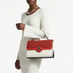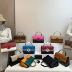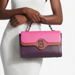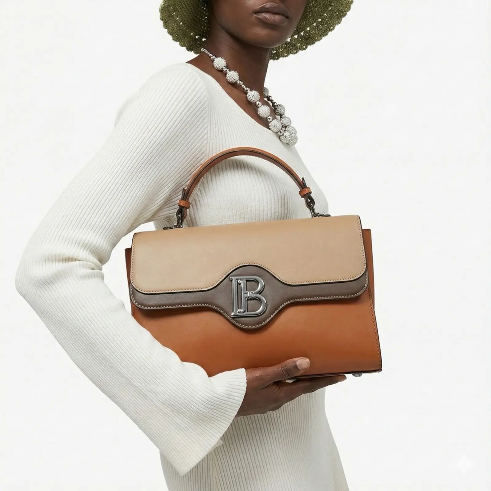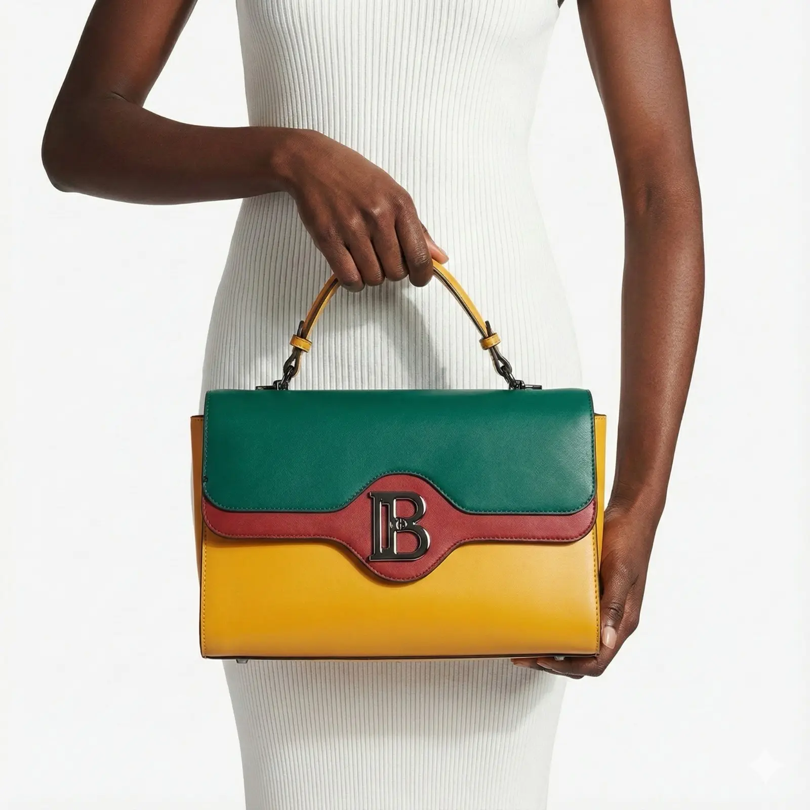 A stylish leather handbag featuring a prominent B-logo metal clasp. This set includes a matching long wallet and a detachable shoulder strap. Available in various elegant tri-color combinations including pink/purple, green/yellow, and classic brown tones. Durable material with a premium feel.