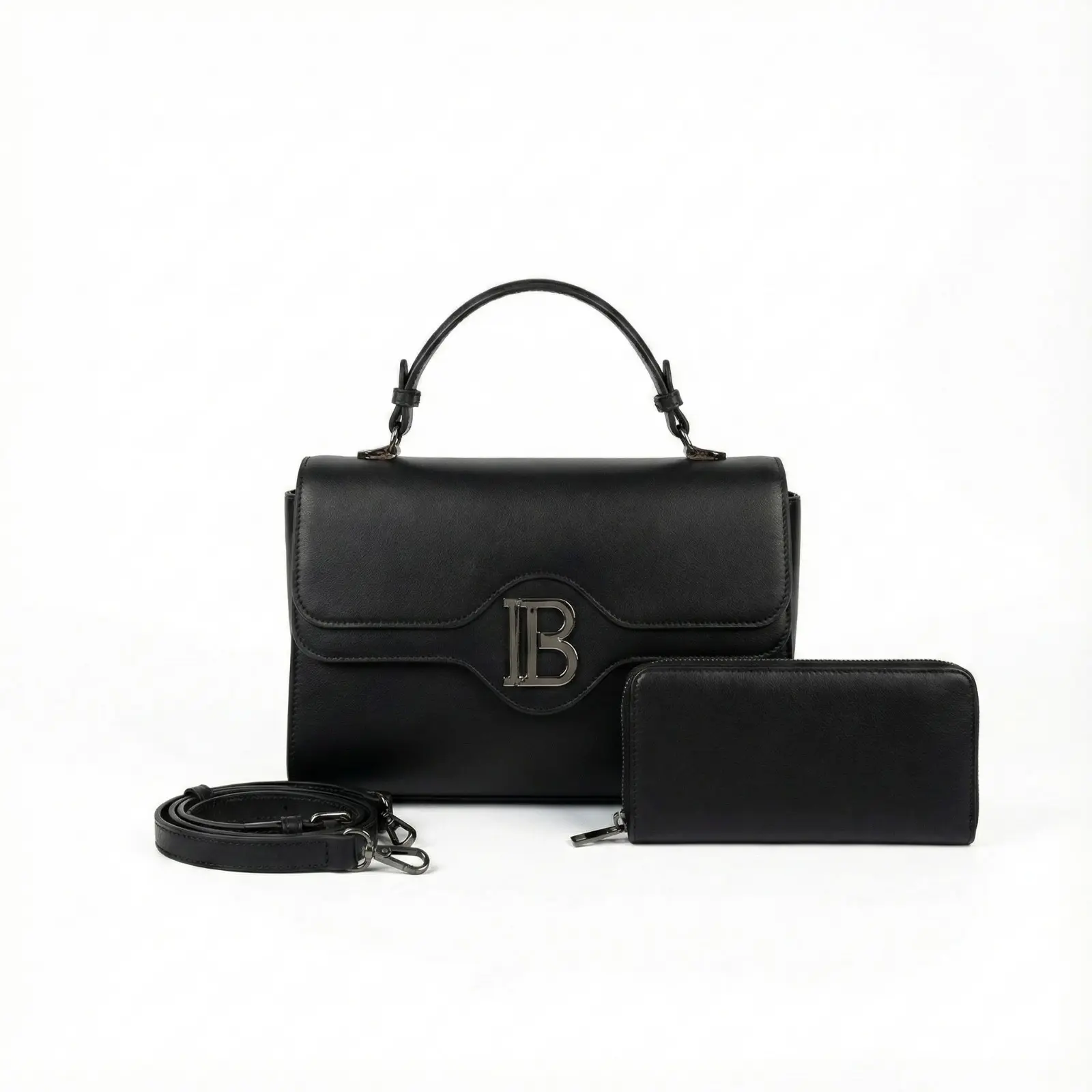 A stylish and high-quality leather handbag featuring a prominent B-logo design. This set includes a matching long wallet and a detachable shoulder strap. Available in various elegant multi-color combinations suitable for work, events, and daily use.