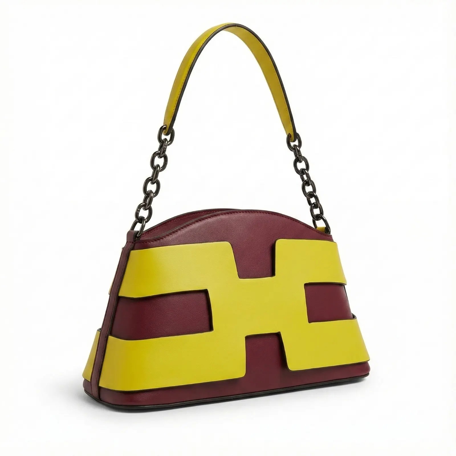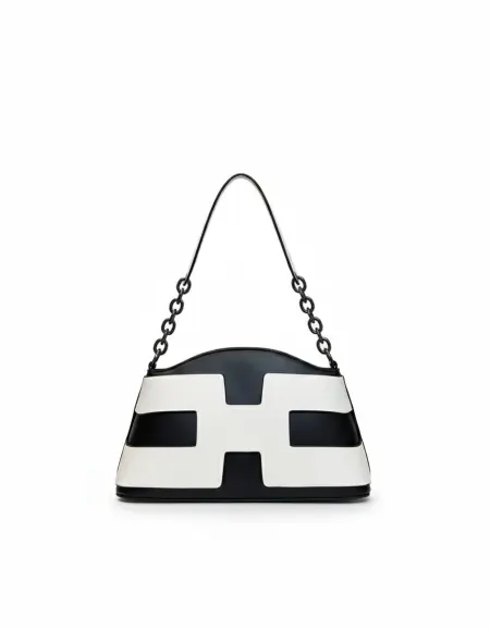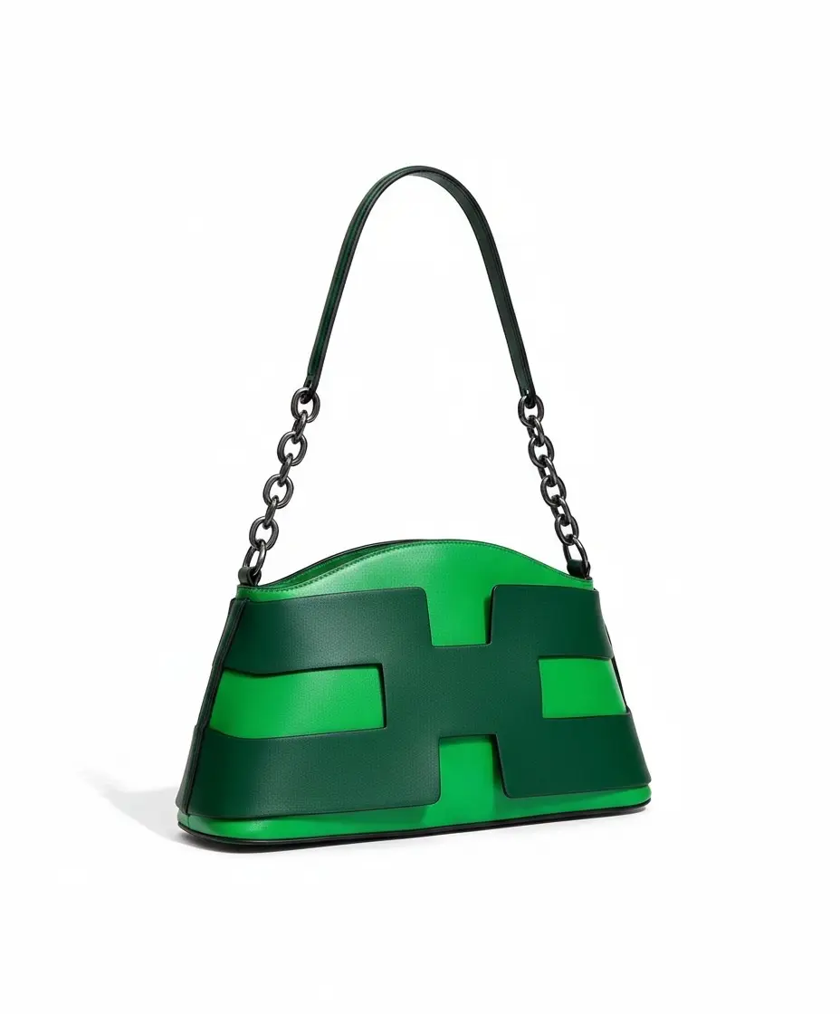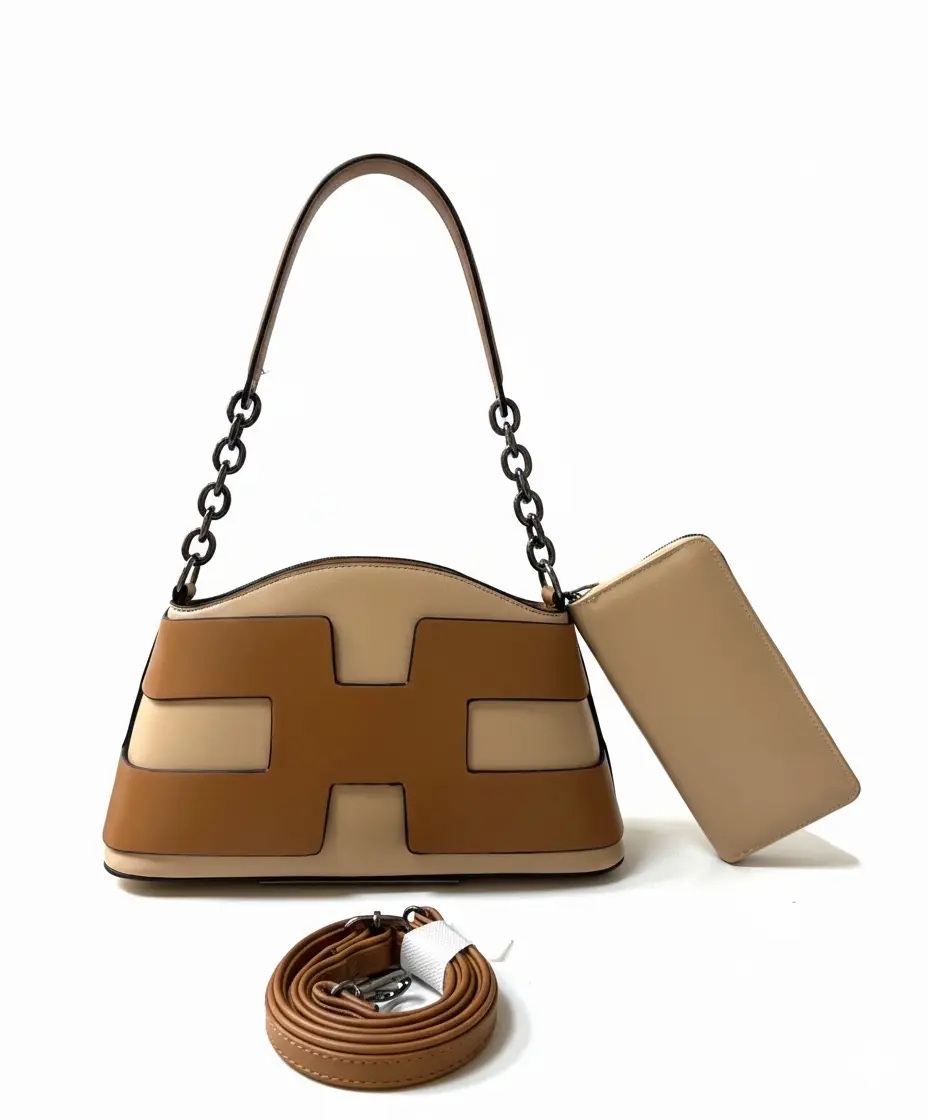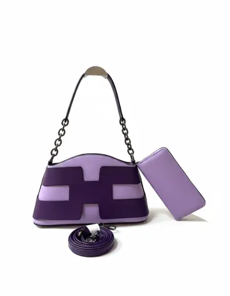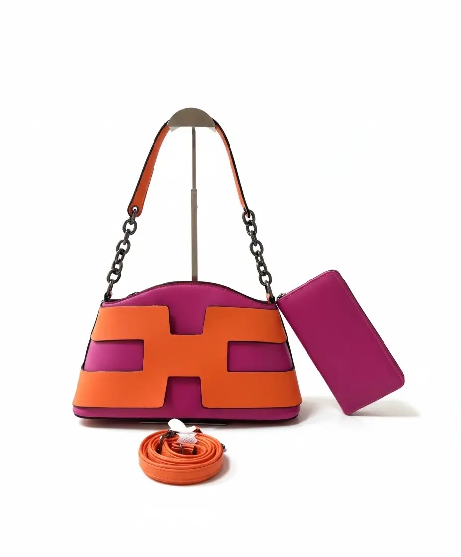 A stylish two-tone handbag featuring a unique H-shaped design. This set includes a matching zip-around wallet and a detachable long shoulder strap for versatile carrying options. Available in multiple vibrant colors like green, purple, orange, and classic black.