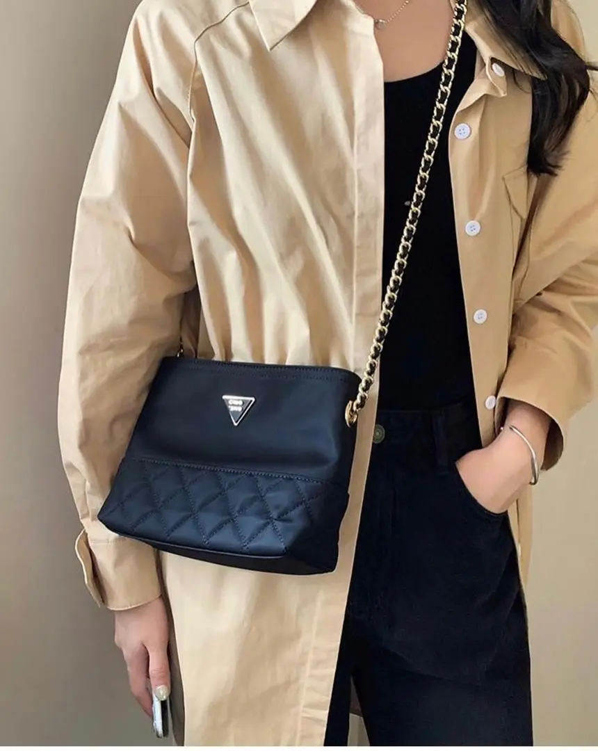 A stylish black shoulder bag featuring a quilted bottom design and a gold-tone chain strap. Made with durable material, it is perfect for daily use, office wear, or special evening events. It offers enough space for your phone, wallet, and makeup essentials.