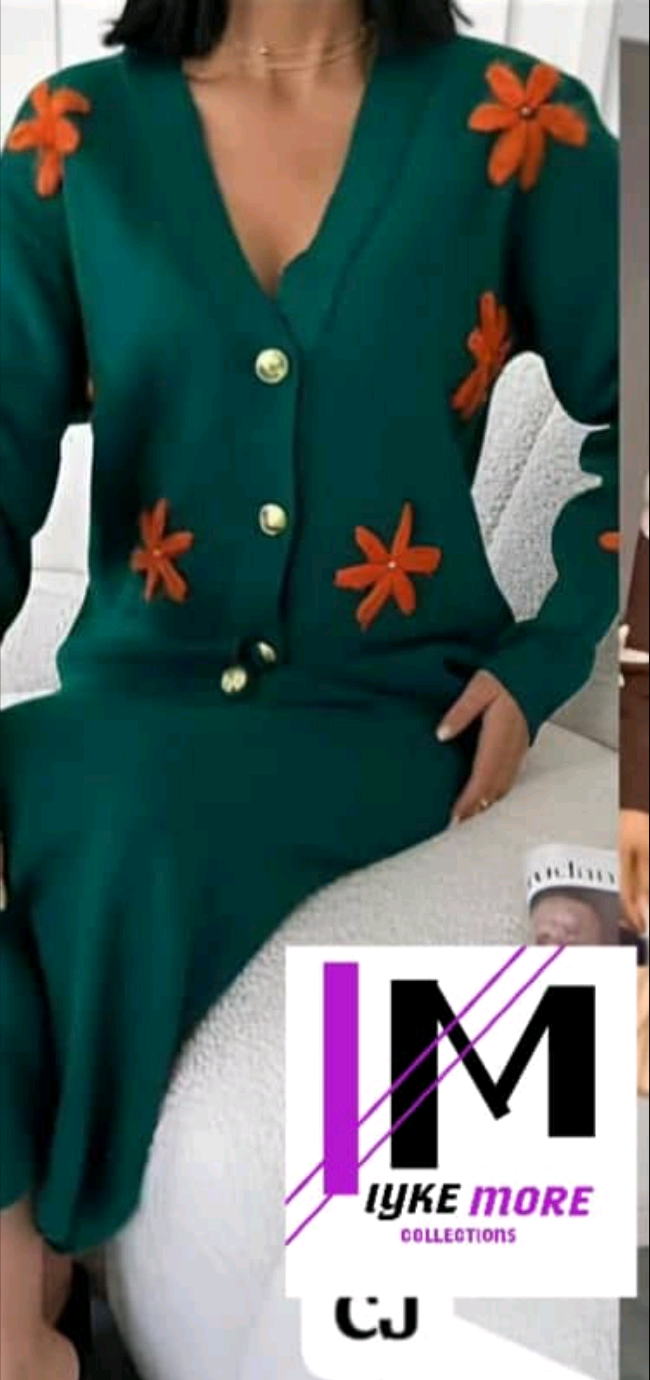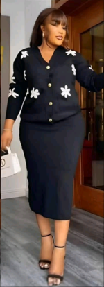 Step out in style and comfort with this beautiful two-piece knit skirt set. It features a long-sleeve button-down cardigan adorned with lovely floral appliqués and a matching midi skirt. This outfit is perfect for any occasion – whether it's an outing with friends, church, or a chic casual event. Made from soft, comfortable knit fabric, it's a must-have for your wardrobe. Get this trendy women's outfit today!