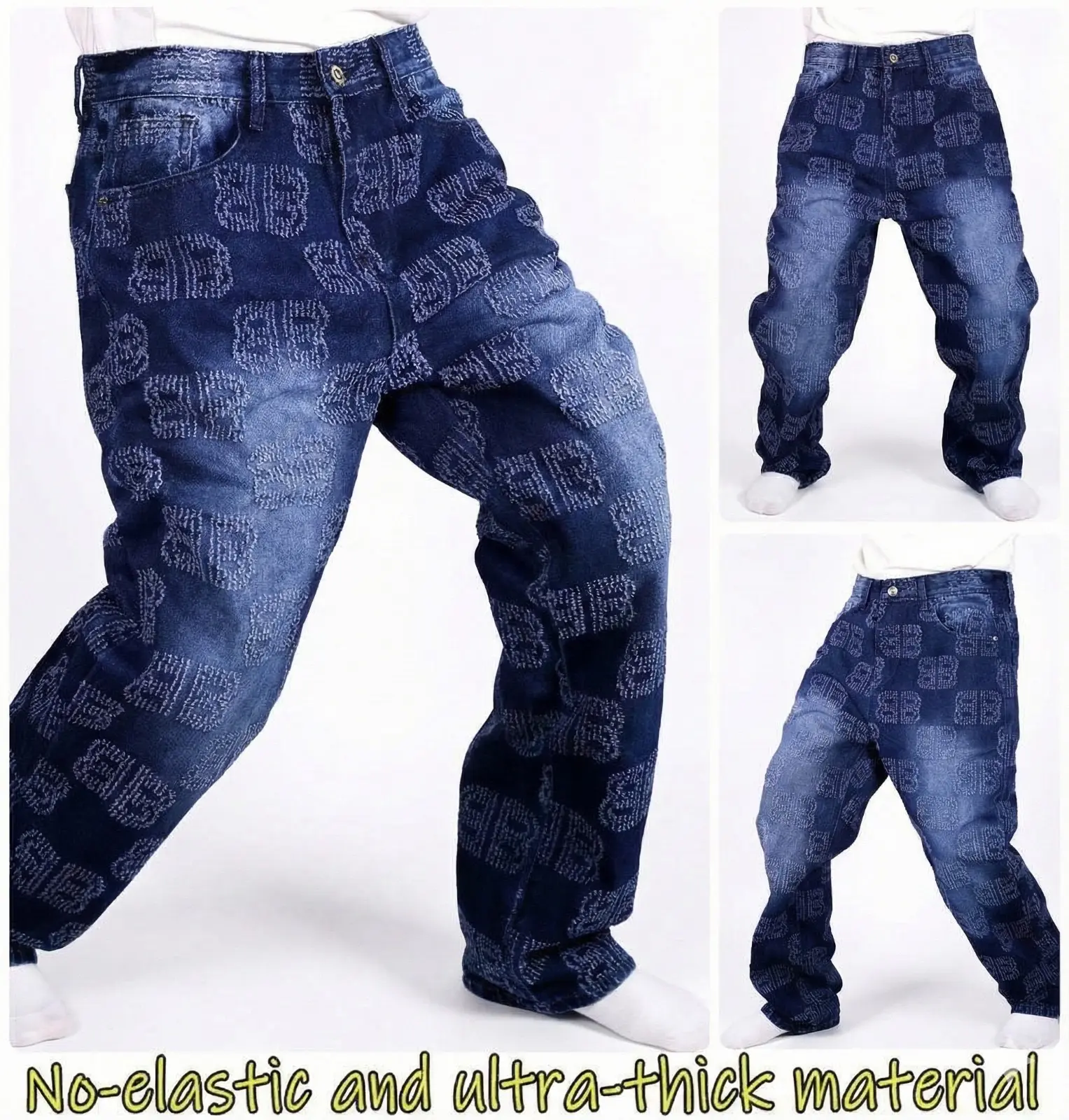 Jeans baggy de haute qualité, non élastiques, avec un motif monogramme élégant. Fabriqués en denim ultra-épais pour une durabilité maximale et un aspect haut de gamme. Idéal pour les sorties décontractées et les amateurs de streetwear.