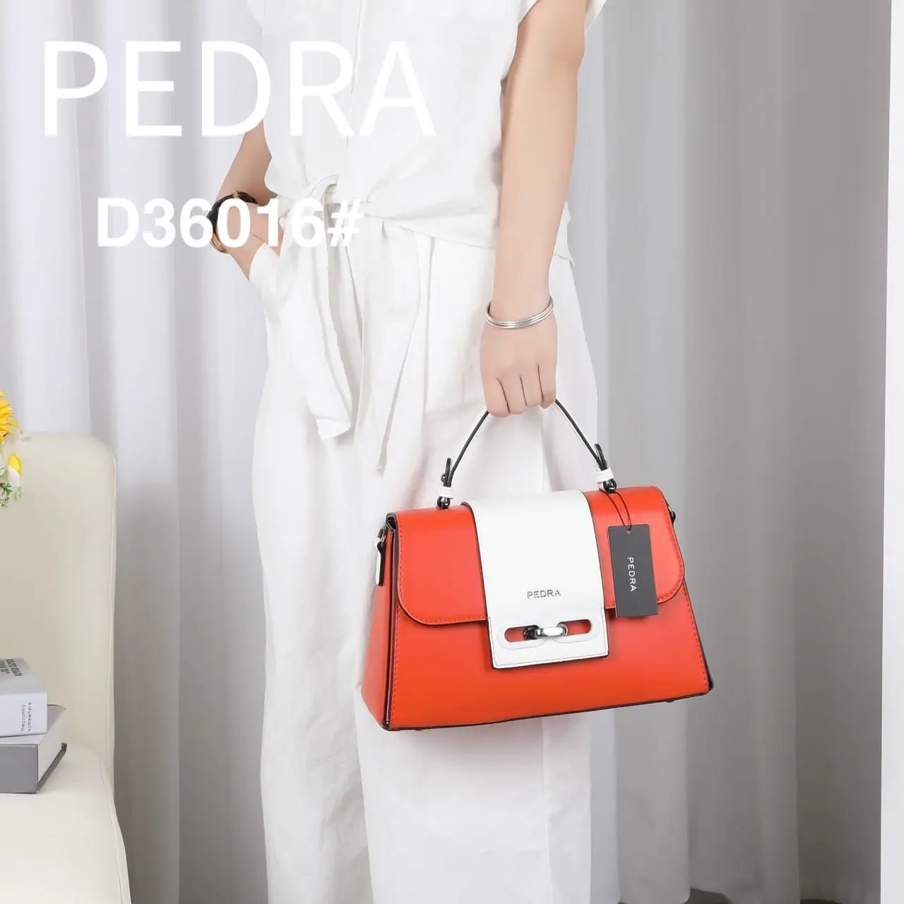 A stylish and versatile top-handle handbag by Pedra, featuring a sleek design with a secure front clasp. Available in multiple colors including black, red, green, and tan. Includes a detachable shoulder strap for multiple carrying options.