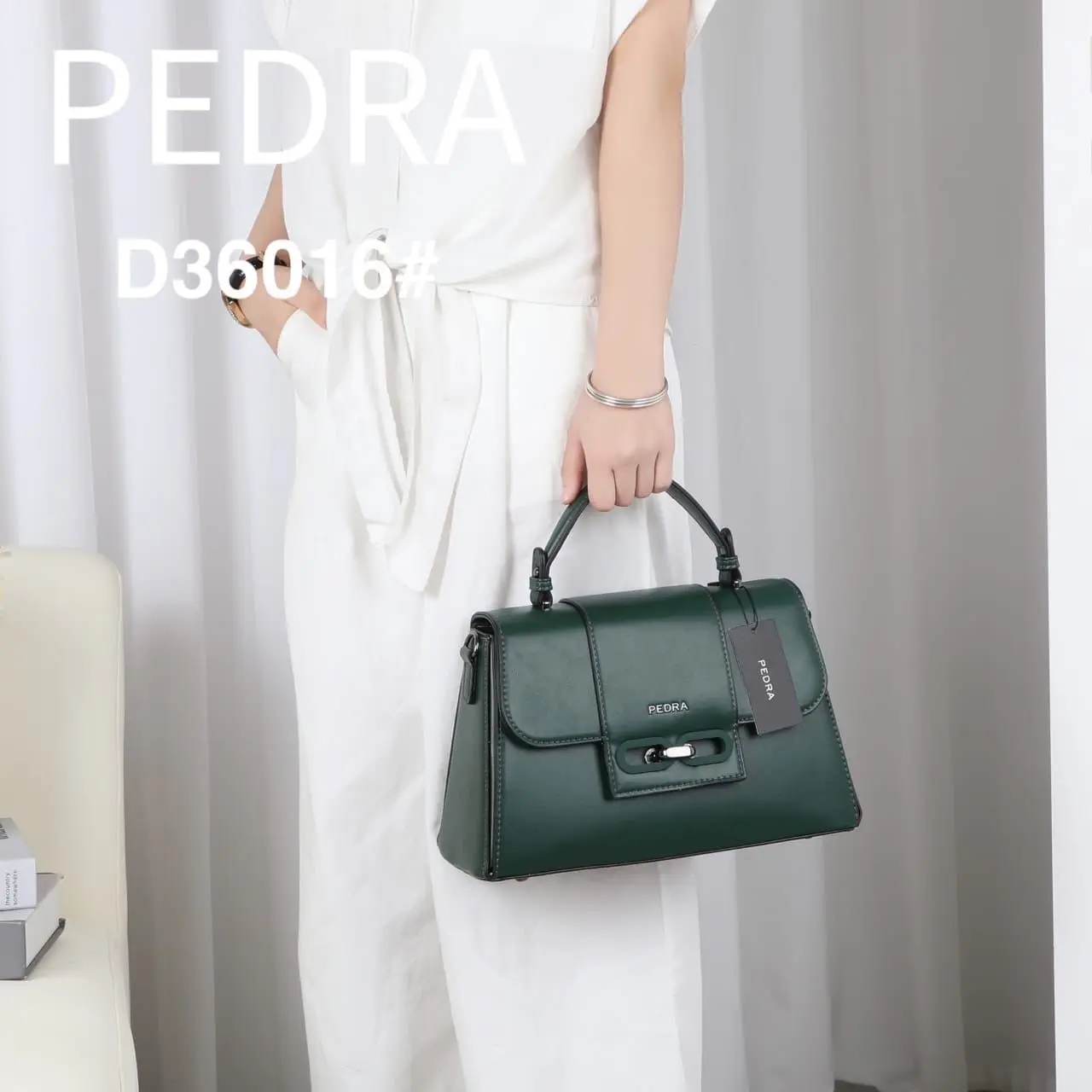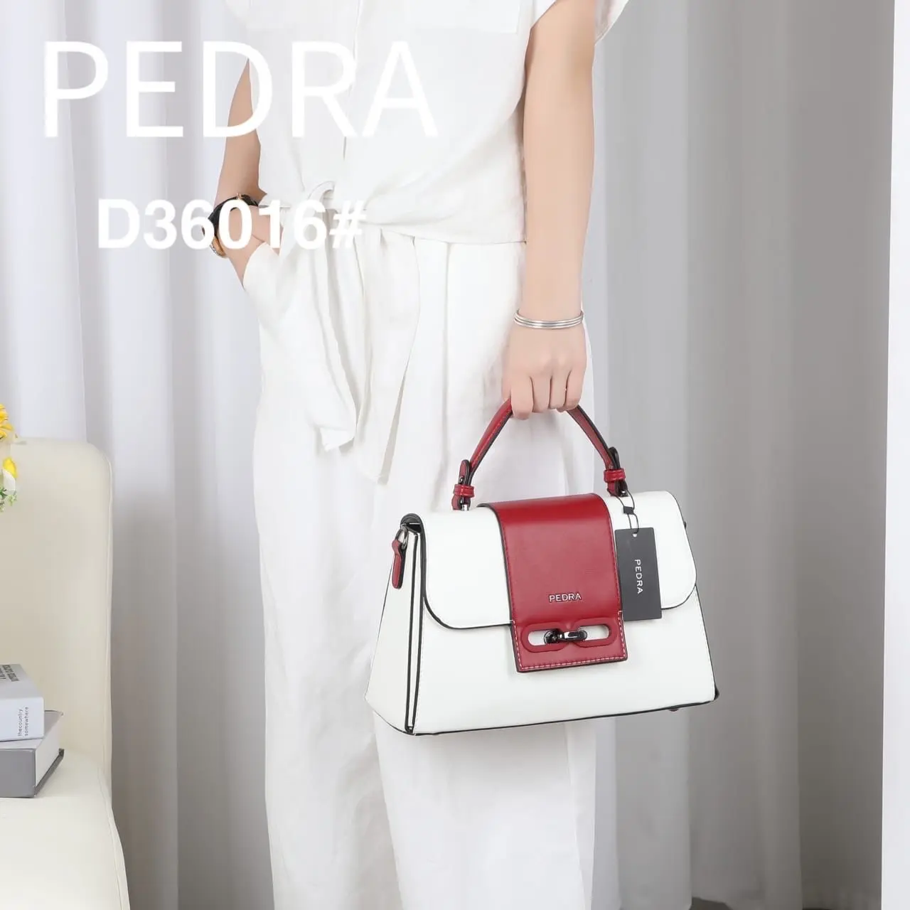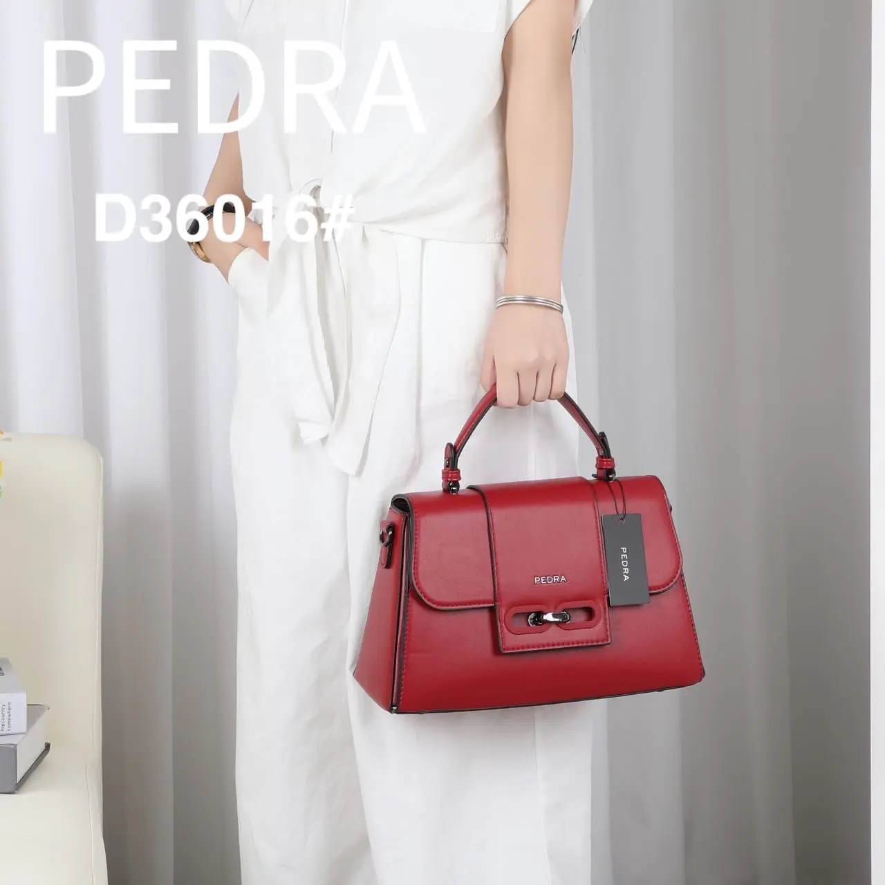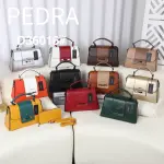 A stylish and durable top-handle handbag by Pedra, featuring a sleek design and high-quality finish. It comes with a comfortable top handle and an adjustable long strap for versatile carrying. Available in multiple colors including black, red, gold, and silver to suit any occasion.