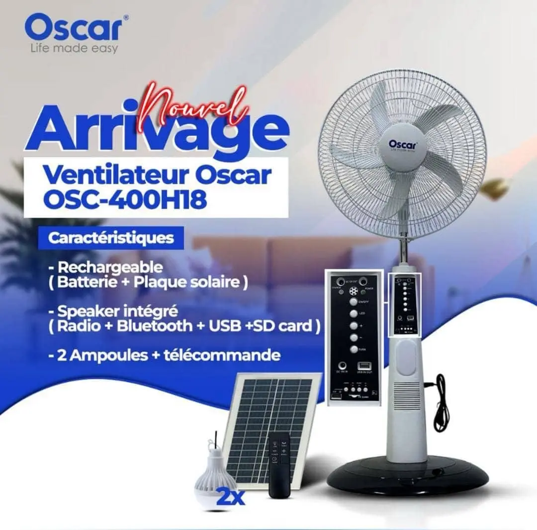 Beat the heat and power cuts with this Oscar OSC-400H18 rechargeable fan. It comes with a solar panel and battery, so you stay cool even when there is no light. It features a built-in speaker with Bluetooth, FM radio, USB, and SD card slots to enjoy music. The set includes 2 LED bulbs for lighting and a remote control for easy use. Perfect for homes and shops. #Cameroon #OnlineShopping #SolarFan #HomeApplianceCameroon #RechargeableFan #Oscar